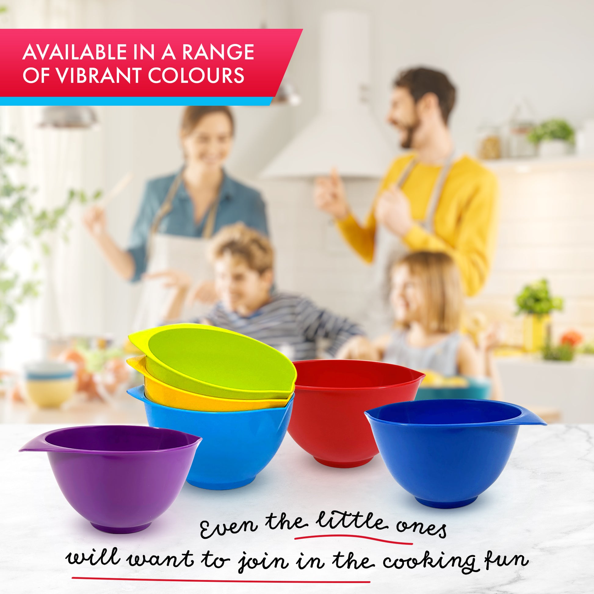 Ready to take your kitchen game to the next level? This set of 6 vibrant, fresh-coloured mixing bowls (yellow, light blue, green, and dark blue, red & Purple) will add a splash of fun to any task! They’re built tough, compact, and stackable—so they’re perfect for all your food prep, baking, and family cooking adventures. And with their handy handle and spout, pouring is a breeze—goodbye spills, hello precision!